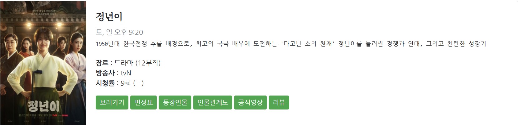 - 내용: 드라마 '정년이'는 일정 주기로 재방송이 진행되며, 특정 시간에 TV와 스트리밍 플랫폼을 통해 시청할 수 있습니다.